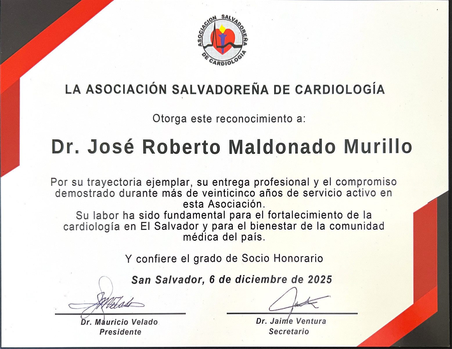 Socio Honorario de la Asociación Salvadoreña de Cardiología