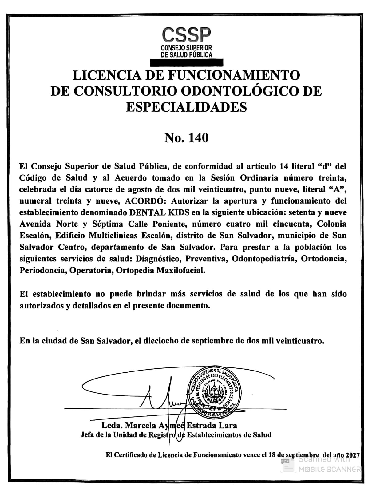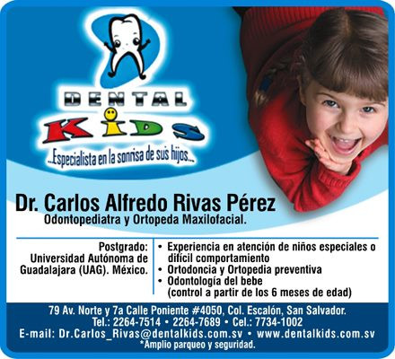 - Clínica privada DENTAL KIDS. Edificio Multiclinicas Escalón, 79 Av. Norte y 7a Calle Poniente #4050, Col. Escalón.